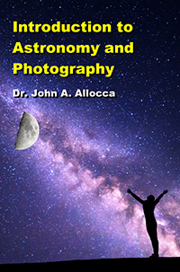Dr. John A. Allocca, Copyright 2024 ISBN 978-1547107346 240 - 6" x 9" pages This book covers the basics of astronomy and photography Table of Contents: Part 1 - Astronomy Basics Introduction Learning Astronomy Binoculars Binocular Collimation Telescopes and Spotting Scopes Magnification Field of View Light Gathering Tripods and Mounts Filters Polar Alignment with an Equatorial Mount Star Charts for the Northern Hemisphere Constellations Moon Phases Perspective of Earth and the Universe Part 2 - Photography Basics Photography Basics Backyard Bird Photography Part 3 - Astrophotography and Observing Astrophotography Basics DSLR Astrophotography A Beginner’s Guide to Imaging the Moon Solar Imaging and Observation with White Light Filtration Solar Imaging and Observation with Hydrogen Alpha Filtration Tracking and Stacking Images Smart Imaging Telescopes CLICK to order the printed book from Amazon CLICK to Return to Page Menu |